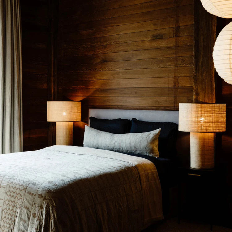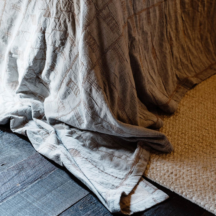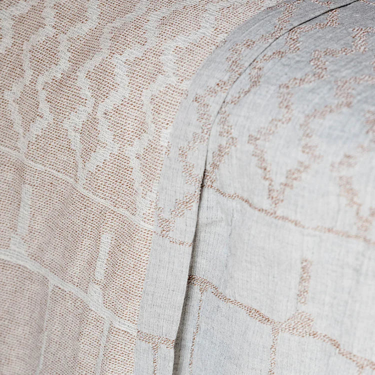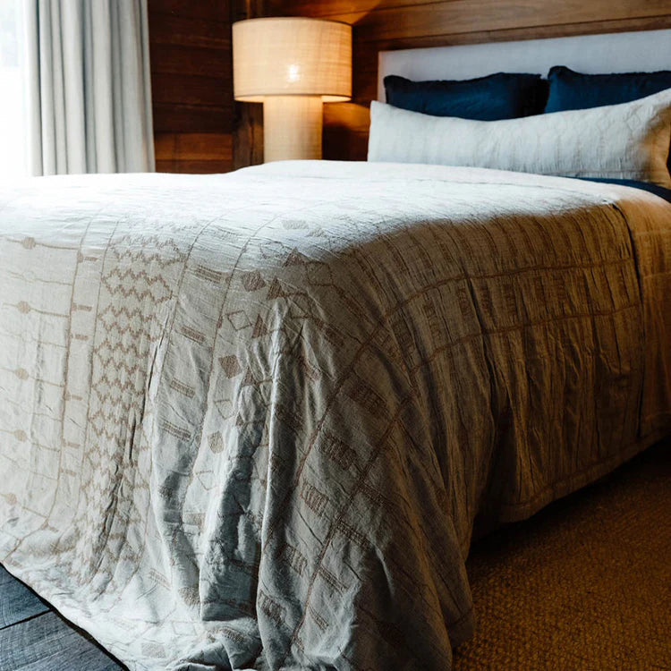Discover serenity with the Kasumi Bed Cover, a harmonious blend of Japanese-inspired design and artisanal craftsmanship. Its geometric pattern rendered in soft clay and muted blue tones, evokes a sense of calm, making it a perfect addition to your space.