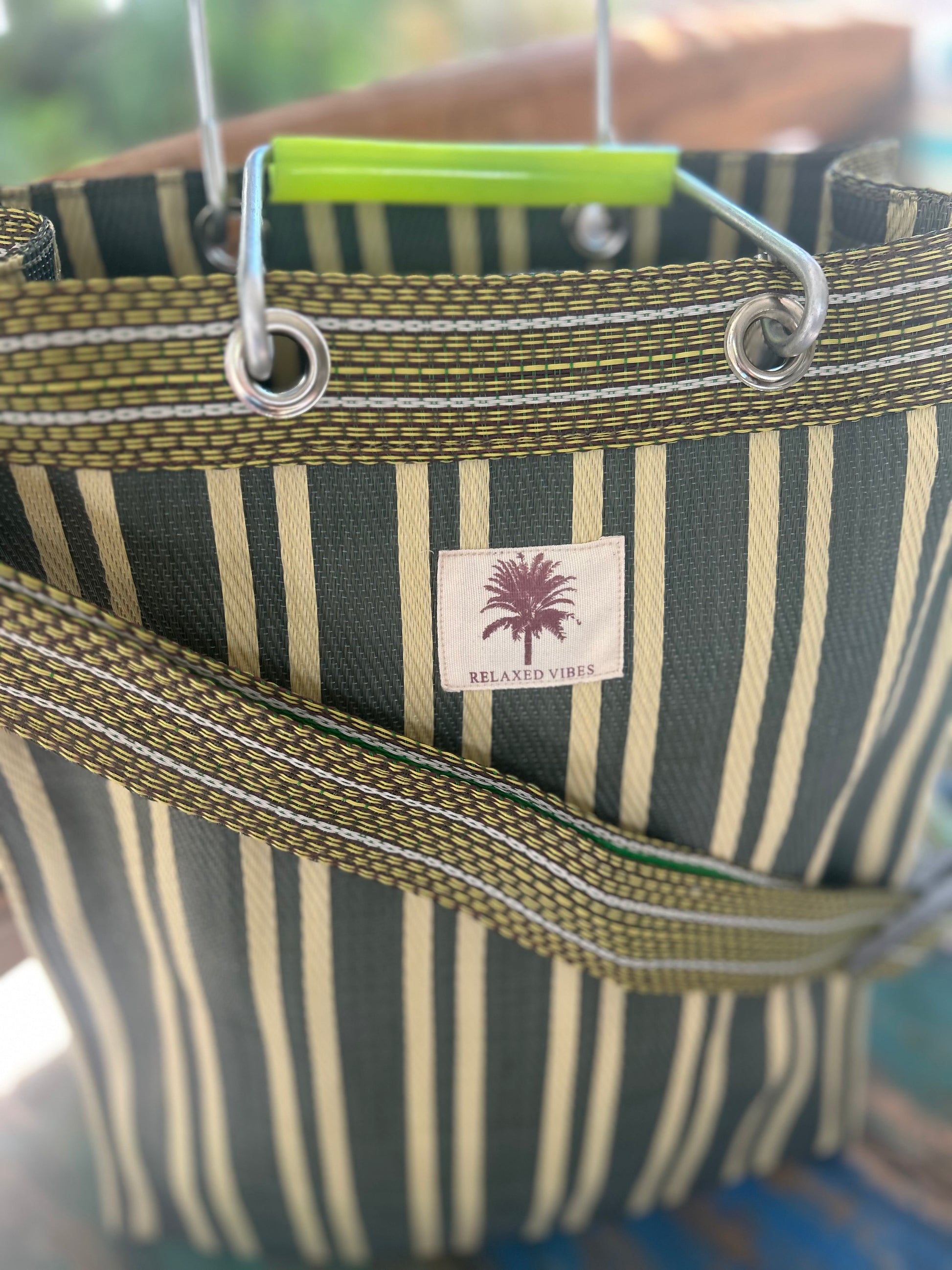 Crafted from 100% recycled materialsand 100% recyclable, these bags are designed with sustainability and style in mind. Perfect for that relaxed day at the beach or stroll through your favourite market.